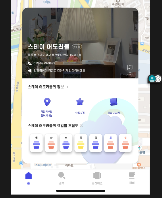 우리 프로젝트는 혼잡도 정보 제공이 주된 기능이었기 때문에 카페 상세 화면에서 이런 점이 사용자에게 잘 나타났으면 좋겠다는 바람이 있었다. UI 측면에서 가장 오랜 시간이 걸렸던 부분도 이 부분이었다고 생각한다.