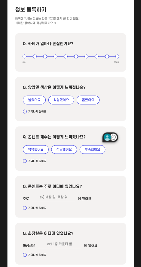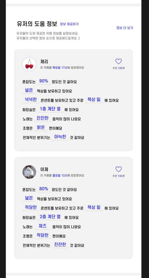 유저의 도움 정보라고 유저들이 카페에 가서 느낀 내용을 주어진 양식에 맞게 작성해주면 상세 화면에 띄워주는 기능(첫 번째 사진)이 있었는데, 유저가 작성한 내용을 문자 그대로 띄워줘야 하다보니 유저에 따라서 양식에 맞게 작성하지 않을 수도 있고 ... 상세 화면에서 어색하게 띄워질 수도 있는 상황이라 고민을 꽤 많이 했다. 결론적으로 정보를 작성하는 화면에서 양식에 맞게 작성할 수 있도록 유도하는 방법(두 번째 사진)을 썼다. 저렇게 예시를 쓰라고 누가 추천해줬었는데 사실 처음에는 뭔가 예뻐보이지 않아서 이게 맞나 싶었는데 사용자 친화적인 디자인 관점에서는 이게 맞았던 것 같다! 누가 말해줬는지 기억이 안나서 문제지만 ㅎㅎ 감사합니다