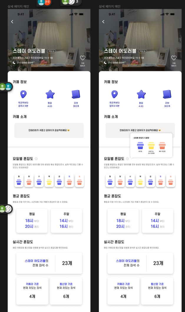 우리 프로젝트는 혼잡도 정보 제공이 주된 기능이었기 때문에 카페 상세 화면에서 이런 점이 사용자에게 잘 나타났으면 좋겠다는 바람이 있었다. UI 측면에서 가장 오랜 시간이 걸렸던 부분도 이 부분이었다고 생각한다.